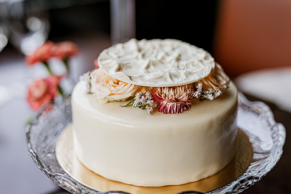 Beställ er bröllopstårta i samband med drop-in vigseln hos oss. Tårtan bakas av Fabrikskökets konditorer. Till vår drop-in vigsel skapar vi en speciell bröllopstårta med en känsla av vinter. Den bakas med vit chokladkaka med citron och mandarin curd, mandelpraline, vit chokladbavaroise med citrus och vit chokladglaze, dekorerad med vit chokladdekor och färska blommor.